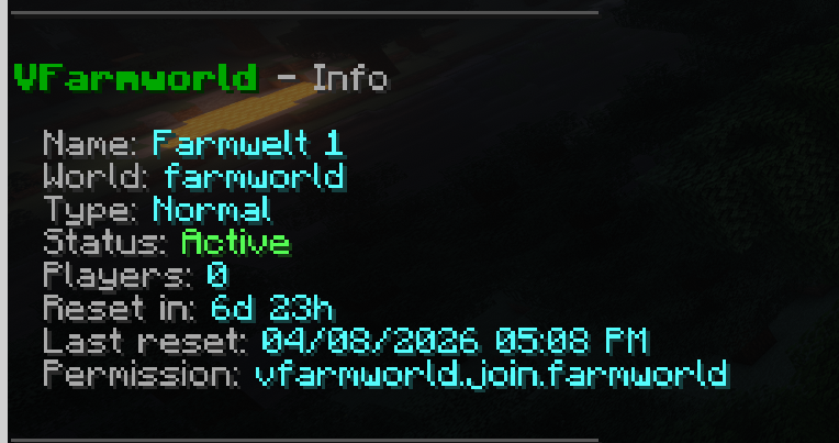 | Farmwelt-Info | Detailansicht: Typ, Status, Spieler, letzter Reset, benötigte Permission |