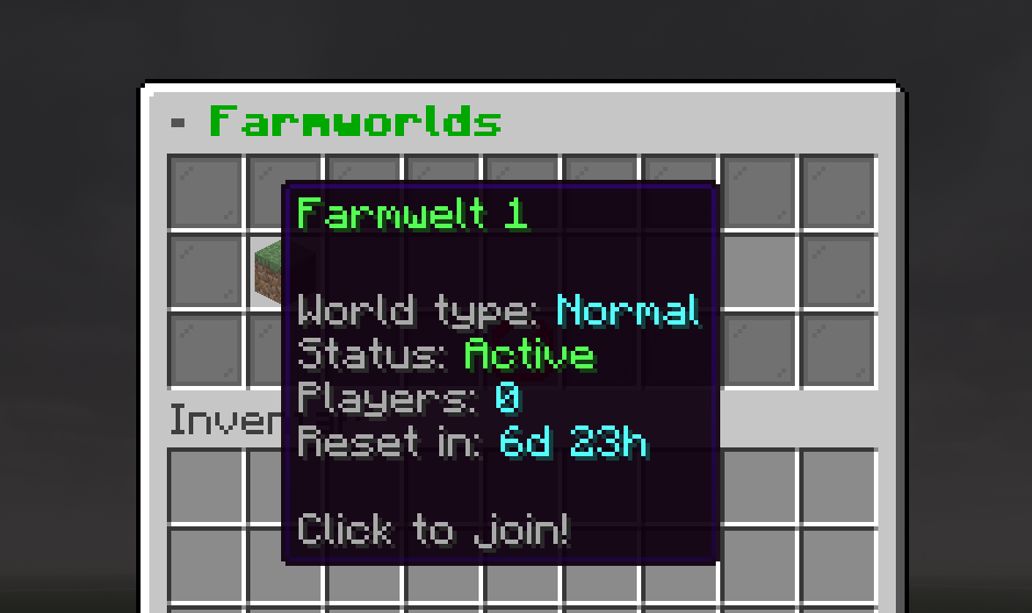 | Farmwelt-Liste | Alle Welten mit Status, Spieleranzahl, Reset-Timer – per Klick beitreten |