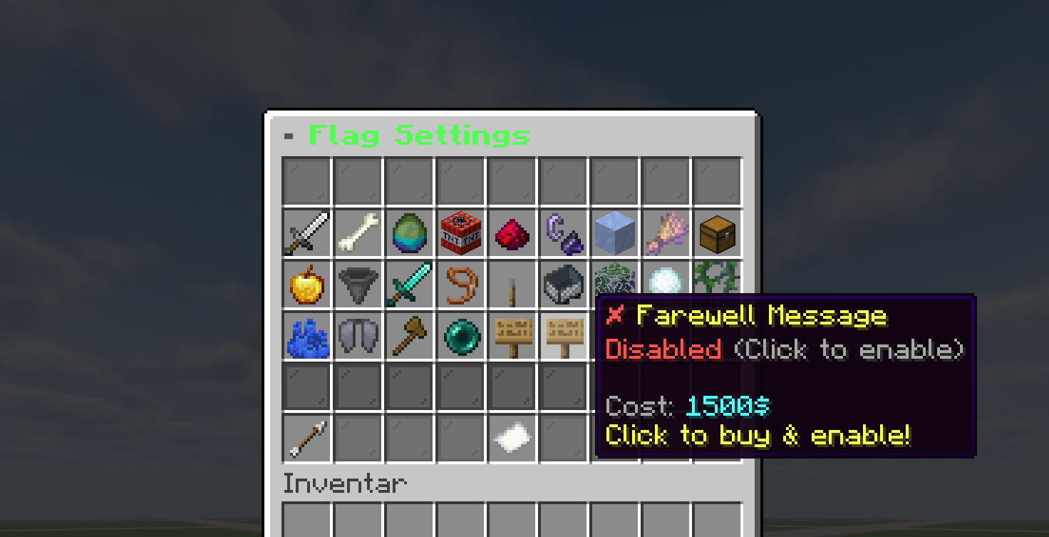 - ⚙️ Komplett konfigurierbar – Flag-Preise, Border-/Zaun-Materialien, Biome, Musik, Marktplatz-Einstellungen, Hopper-Limits, GUI-Zeilen