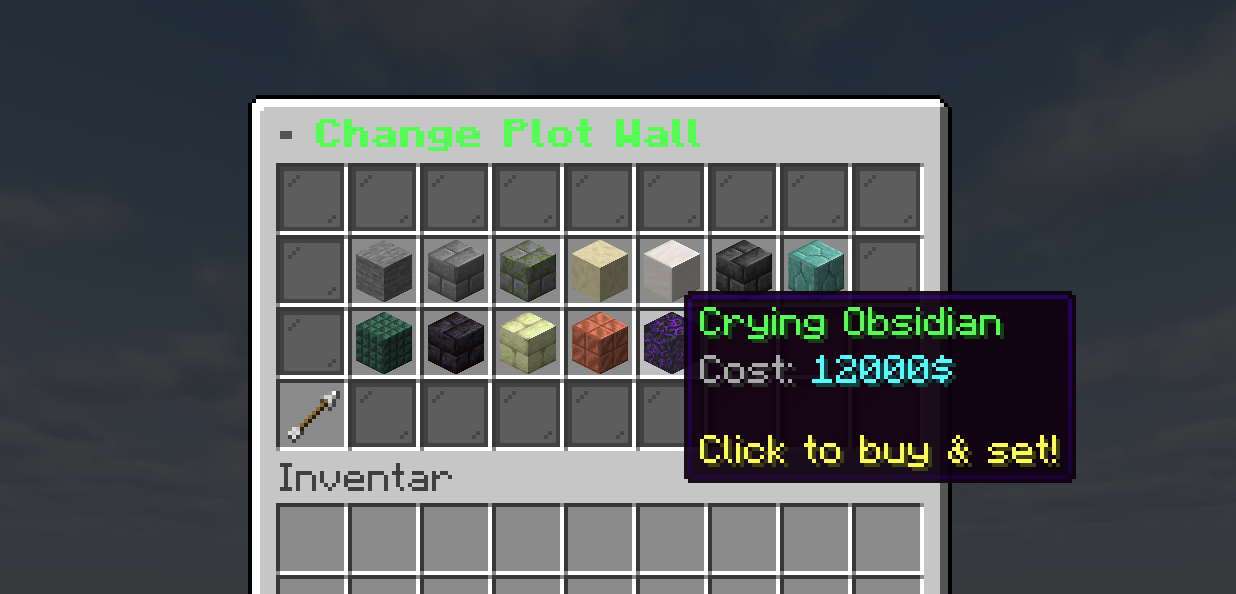 - 🧱 Wand-Anpassung – Plot-Wände aus 14 Materialien wählen (Stein, Quarz, Obsidian, Prismarin, Purpur, ...) – einmalig kaufen