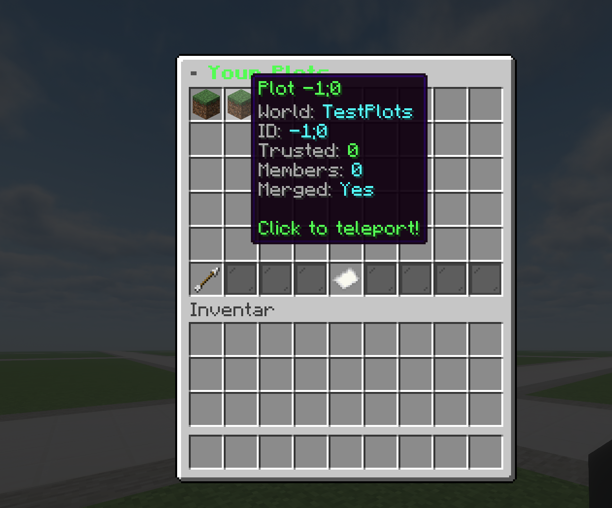 | Plot-Liste | Alle eigenen Plots, Klick zum Teleportieren – blätterbar |