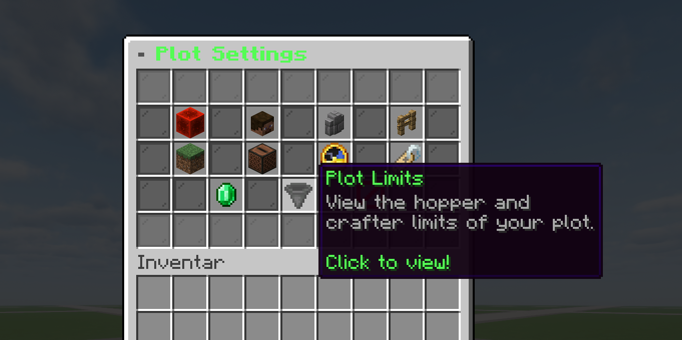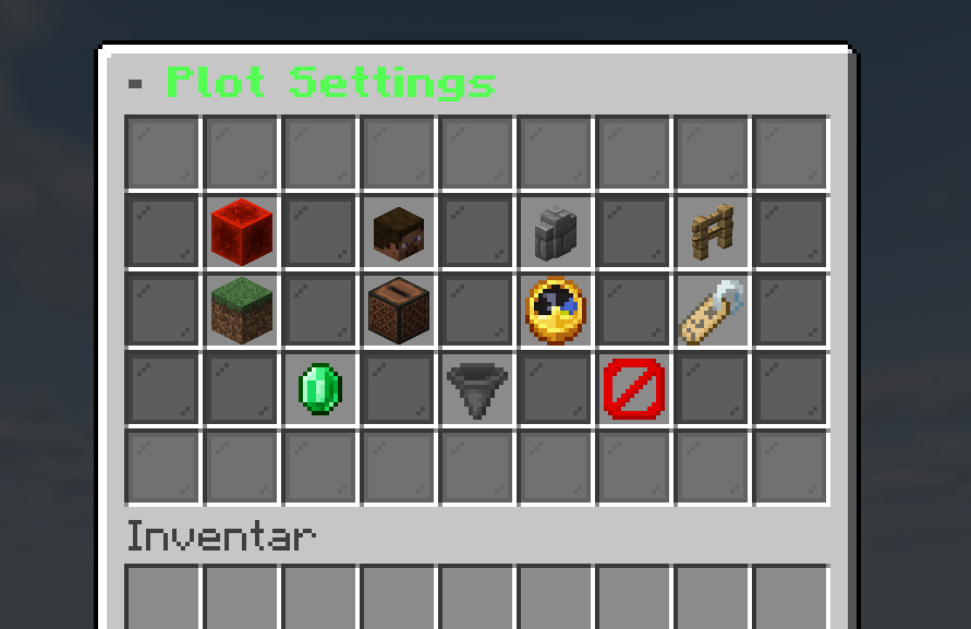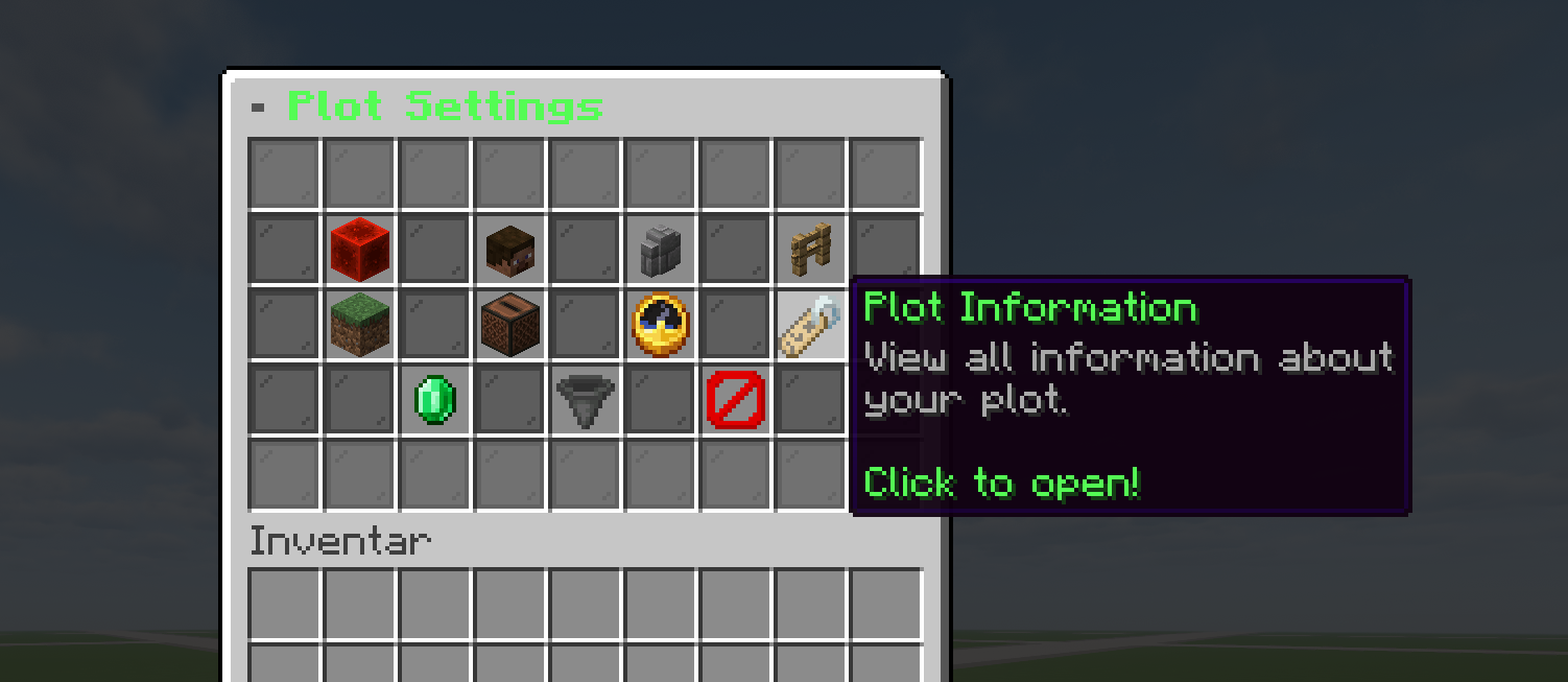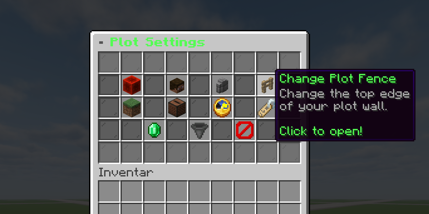 | Plot-Einstellungen | Flags, Spieler, Wand, Zaun, Biom, Musik, Zeit & Wetter, Infos, Verkauf, Limits, Löschen |