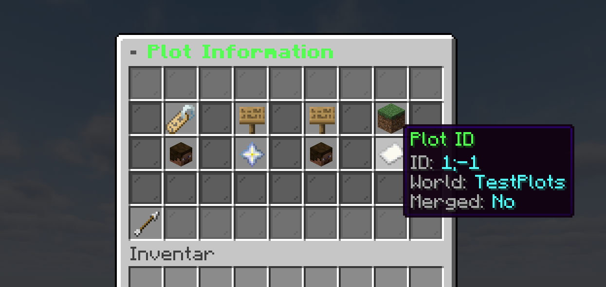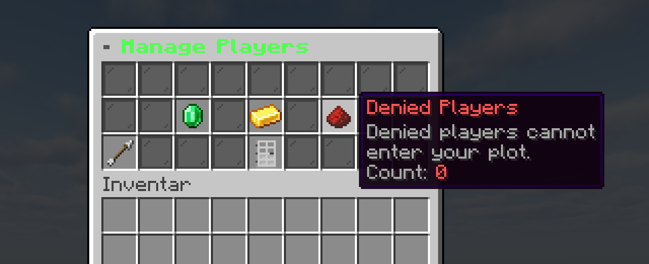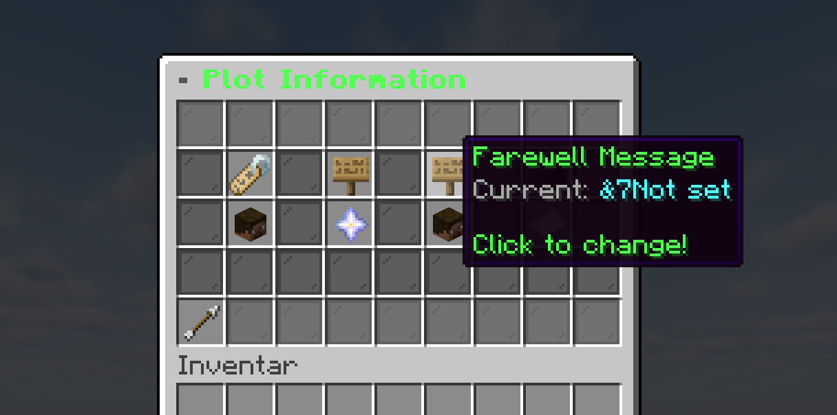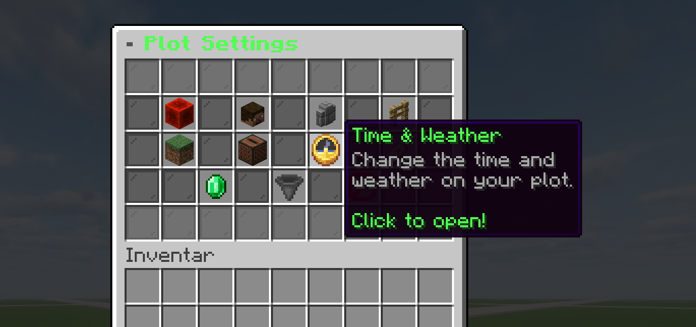 | Plot-Einstellungen | Flags, Spieler, Wand, Zaun, Biom, Musik, Zeit & Wetter, Infos, Verkauf, Limits, Löschen |